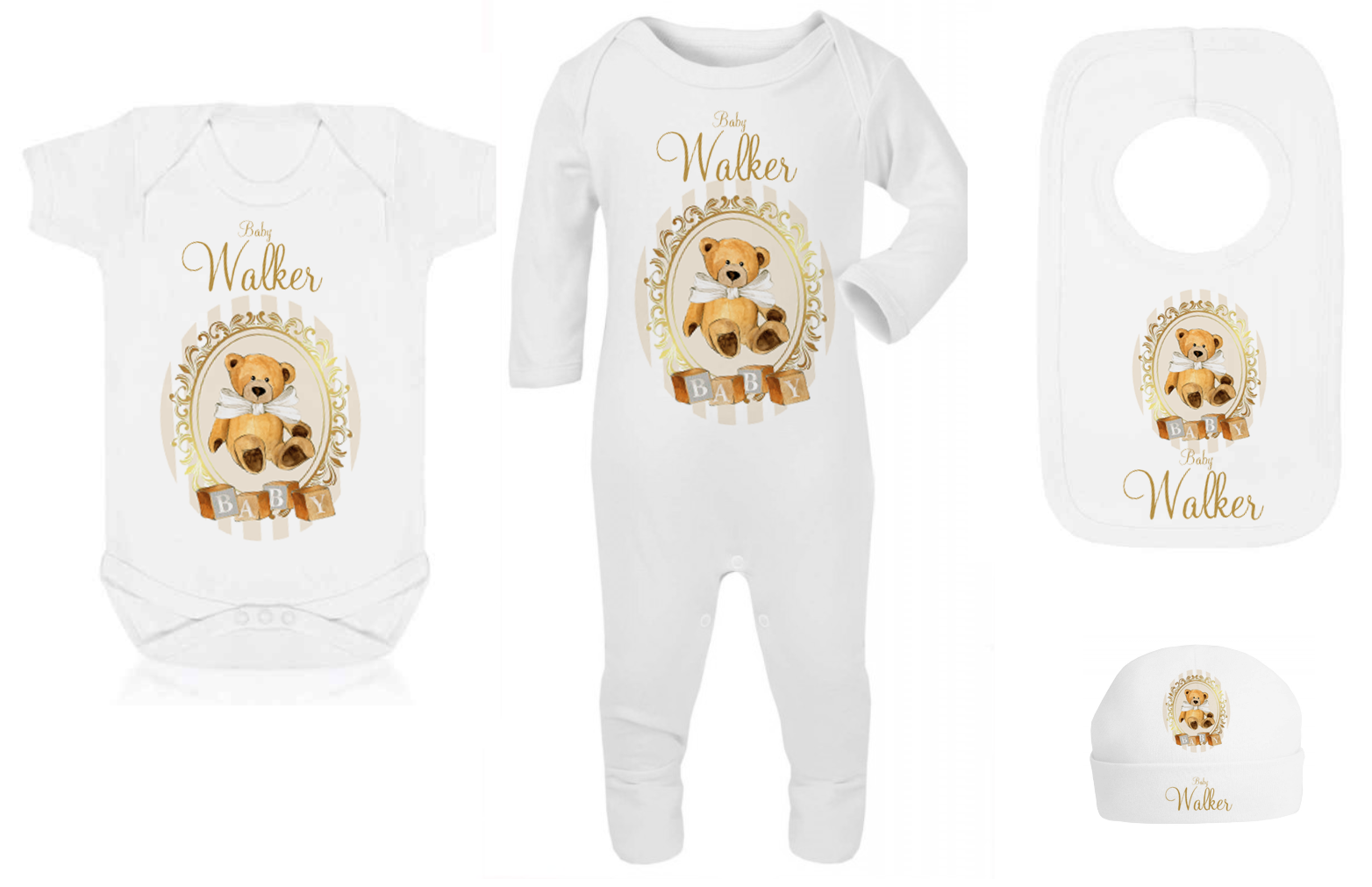 All item are pure white fabric and super soft with popper button on legs of the baby grow and center bottom of the vest.