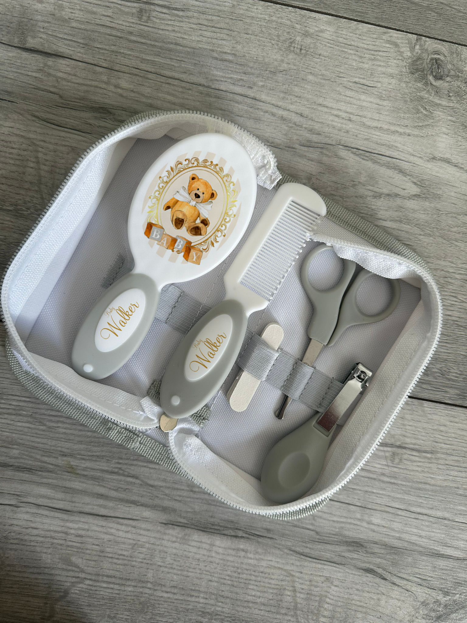 Type: Nail Clippers, Nail File, Baby Comb, Baby Brush, Baby Scissors and Nasal Clearer. all comes in a handy zip up case with security straps to keep little one's items organised.