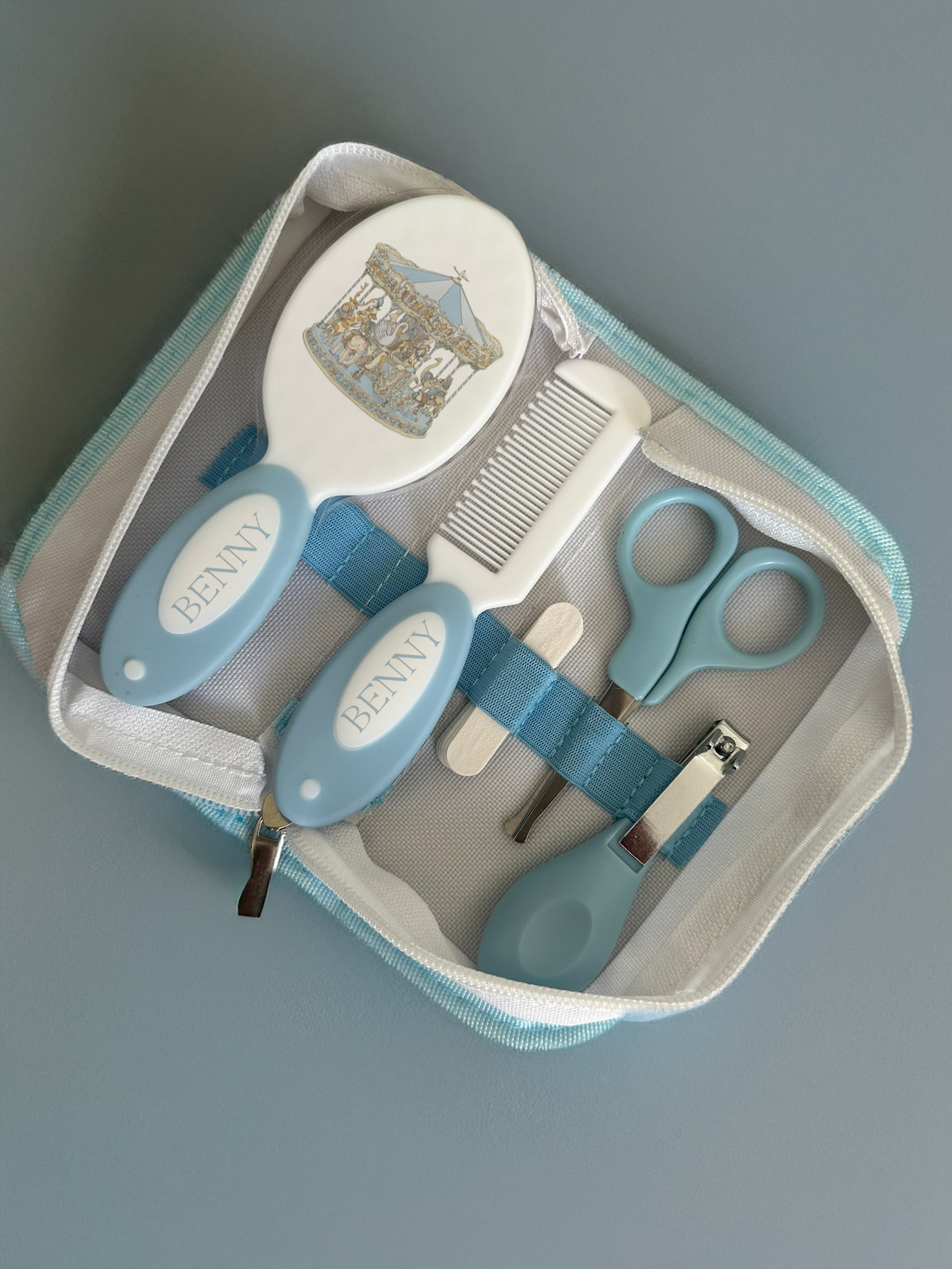 Type: Nail Clippers, Nail File, Baby Comb, Baby Brush, Baby Scissors and Nasal Clearer. all comes in a handy zip up case with security straps to keep little one's items organised.