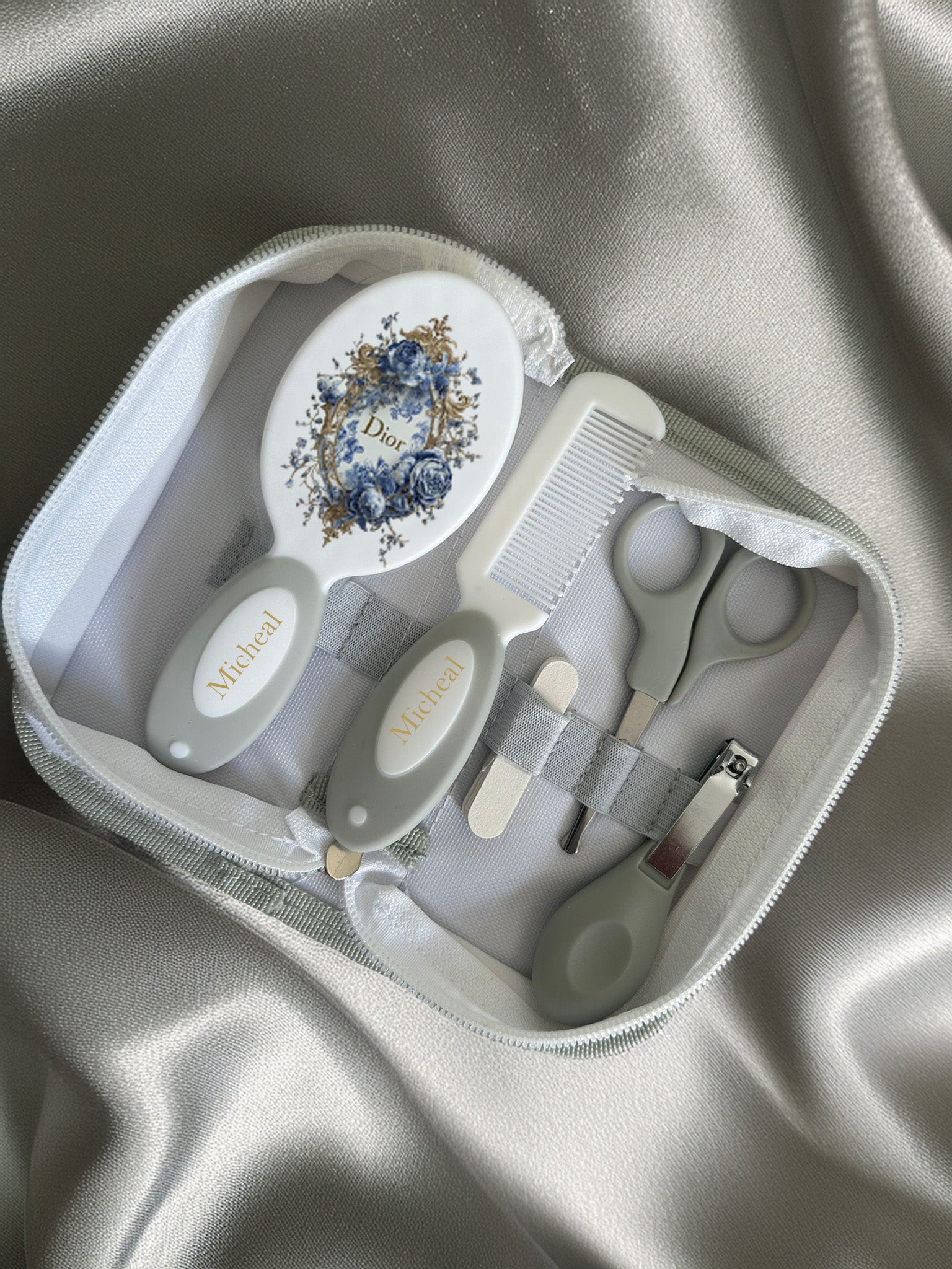 Type: Nail Clippers, Nail File, Baby Comb, Baby Brush, Baby Scissors and Nasal Clearer. all comes in a handy zip up case with security straps to keep little one's items organised.