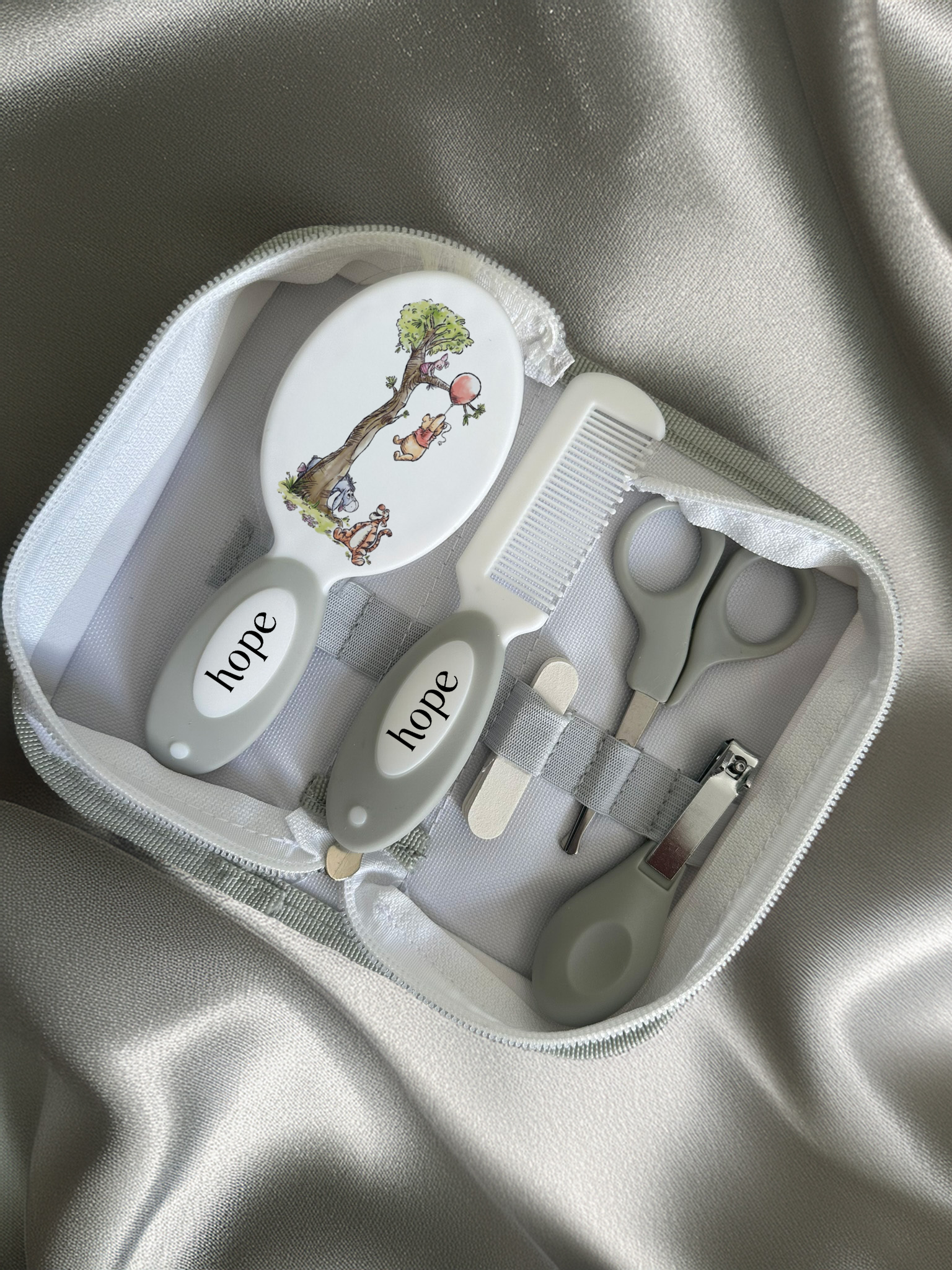 Type: Nail Clippers, Nail File, Baby Comb, Baby Brush, Baby Scissors and Nasal Clearer. all comes in a handy zip up case with security straps to keep little one's items organised.